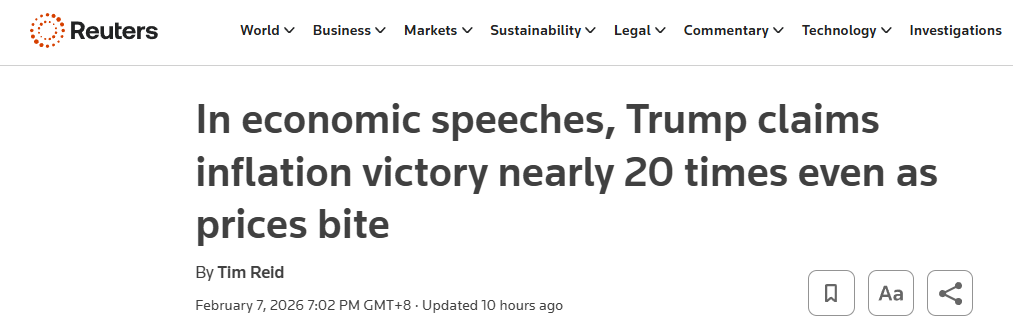 路透社近日报道称,美国总统多次在各种经济演讲中表示“通胀已被击败”、“物价正在下降”,但相关言论与当前经济指标和许多美国人的真实感受相矛盾。 △路透社报道截图 路透社自去年12月以来已整理了他的五篇经济演讲。报告发现,虽然其中有近20篇演讲称“美国的通胀已被击败或显着降低”,近30篇称“物价正在下降”,但演讲中很少提及人们仍然感受到的生活成本压力。 “通胀已被克服”与“物价仍居高不下”之间的差距 路透社指出,尽管过去一年美国通胀率一直徘徊在3%左右,许多生活必需品的价格继续上涨。数据显示,过去一年碎牛肉价格上涨约18%,咖啡粉价格上涨约29%。报告认为,这一数据与美国声称的“生活成本危机已经解决”形成鲜明对比。相关声明称,通胀问题“已经解决”,这很难与人们在超市等日常消费环境中的经历相吻合。 △路透社报道截图 收入和就业指标并未明显缓解压力。路透社援引官方数据称,截至2025年12月的一年里,美国食品价格上涨超过3%,但平均时薪仅比上年上涨约1.1%。同期,美国失业率升至 4.4%,高于本届政府上任时 2025 年 1 月的 4%。报告还指出,相关规范他多次提到鸡蛋、汽油和其他商品的价格下跌。数据显示,2025年12月,鸡蛋价格较去年同期下跌约21%,汽油价格也较去年同期下跌约4%。不过,路透社指出,鸡蛋价格在2025年初一度飙升60%,而汽油价格下降幅度相对有限。报告显示,总体而言,Thisdos Unidos的购物车成本持续上涨,咖啡、牛肉和部分水果等物品的价格低于去年。他强调,每年都在持续上涨。 出典 | CCTVグローバル情报编辑 | ドン・チェンシャオのサイン | 李秀丽プロデューsu | 蔡耀源